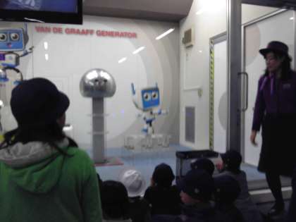 静電気発生装置に代表二人が入り体験。