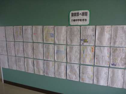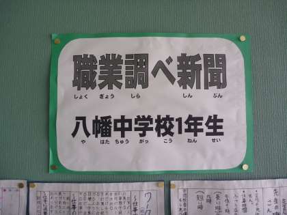八幡中学校の職業調べ新聞が八幡小に掲示されました!自分たちで様々な職業を調べ、その内容を新聞にまとめています。実際にその仕事の方に聞いたり、ネットで調べたり、本で調べたりしながら作ったようです。