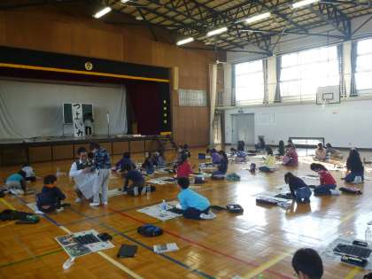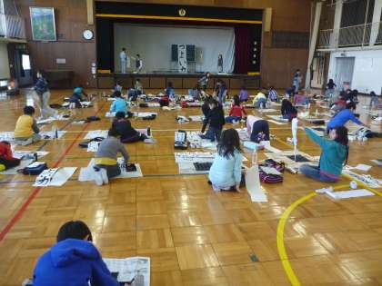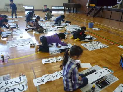 各学年が願いを込めて、書き初めを行いました。3年生はストーブで少し暖かくなった体育館で、ステージの上に貼った大きなお手本を見ながら、作品を完成させていました。