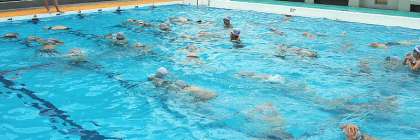 さあいよいよプールに入ります。肌寒いので子どもたちはこわごわ水の中へ。水温はまあまあ高いので入ってしまえば大丈夫なのですが。ところが、この頃から気温が急に下がり始めたため、いくつかの水慣れの活動をした後、残念ながら早々に切り上げました。
