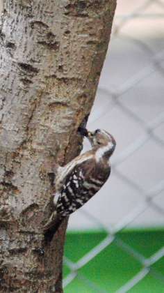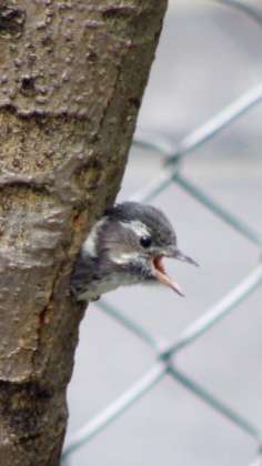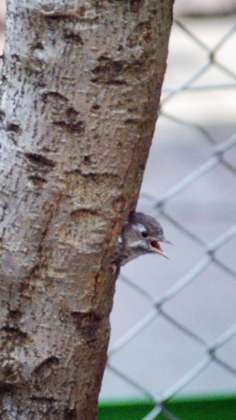16日(火)、10時ごろ、今日もコゲラのヒナが巣穴から顔を出してさえずっていました。そこに親鳥がやってきて給餌。親鳥はすぐに次のエサを求めて飛び去りました。しかし、ヒナは昨日と違って落ち着かないようす。まわりの様子をうかがいながら、さかんに身を乗り出しています。巣立ちが近いことを思わせます。