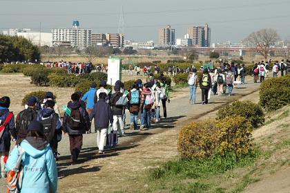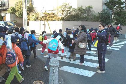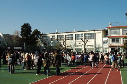 20日(水)全校で「たこあげ大会」を行いました。場所は、1年生が浄水場近くの「ぽかぽか広場」2〜6年生は多摩川河川敷です。環状八号線を横断し、田園調布の住宅街を通り、坂道を下っていく長い道のりです。写真は、「左から校庭に全員が集合」「横断歩道の安全を職員総出で確保」「多摩川に到着」