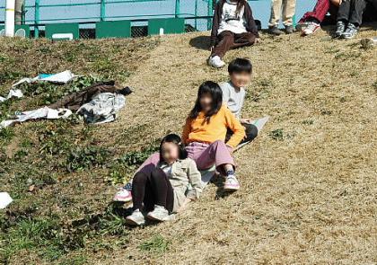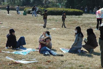 風のない日の凧揚げは、持久力勝負! 走り続けている間はたこがあがっていますが、止まると落ちてしまいます。時間がたつにつれて疲れて横になって休む子、あきてしまって別な遊びを探して楽しんでいる子とさまざま・・・全校遠足のような雰囲気になりました。