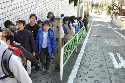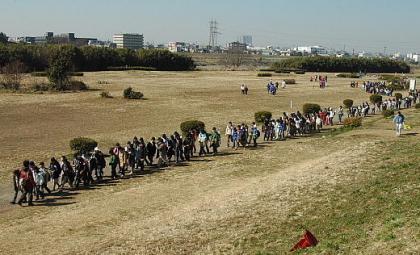 走り回ってヘトヘトになって、おなかはすくし・・・でも帰り道は長い。楽しくすごした多摩川河川敷をあとにして、一路学校へ。途中に「急坂」(写真右)という名前の難関があります。それにもめげず、みんな無事に帰ることができました。風はなくて、たこはあまりあがらなかったけれど、春を思わせる暖かい午前中、広々とした場所で、友達と仲よく、楽しくすごせました。
