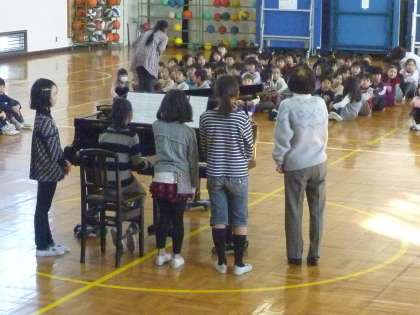 今日の音楽朝会の歌の伴奏は4年生。伴奏を二人で弾いてくれました。メロディ部分は三人で交代に、伴奏部分は一人が通して弾いていました。