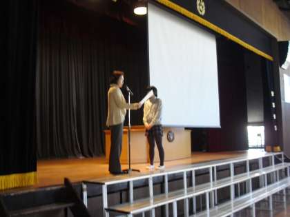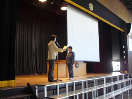 今日は二人の児童が表彰されました。空手で優勝した男子と火災予防の標語で入選した女子です。今年度も多くの児童が様々な分野で活躍しました。今後もさらに挑戦していってほしいと思います。