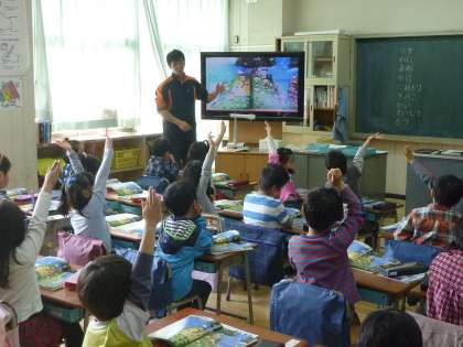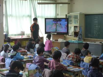 八幡小学校には各教室に50インチのテレビと実物投影機が入っています。この二つは頻繁に使われており、教科書や資料、写真等が画面に映し出され、授業に活用されています。