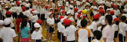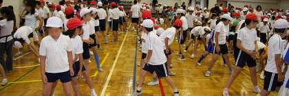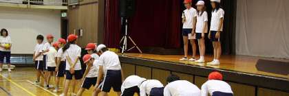 7月2日(木)の体育朝会は、全学年が体育館に集まって「ボール送り」で競い合いました。予定では校庭で行うことになっていましたが、あいにくの雨で体育館で実施。ちょっと手狭でしたが、熱戦が繰り広げられました。