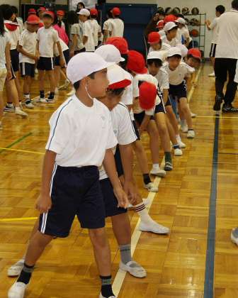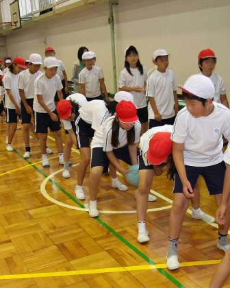 運動委員会の司会進行で、1回戦は頭上をボールリレー、2回戦は股下をボールリレーし、3分間で何周できるか行いました。結果はやはり上位が高学年でしたが、みんなよく頑張りました。