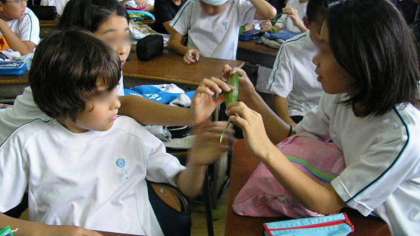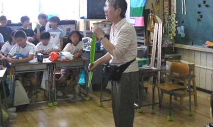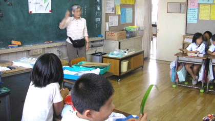 7日(火)、5年生が田植えをしました。様々な理由で予定よりかなり遅くなり、困っていたのですが、学校支援コーディネーターのご尽力により、苗がなんとか手に入り、さらにご指導いただく方も見つかり、やっとこの日田植えにこぎつけたわけです。はじめ教室で稲のことについてレクチャーしていただきました。植物には稲のように葉にたてのスジがあるものと、枝分かれしたスジがついているものがあることを、実物の葉で教えてもらい、子どもたちは感心していました。