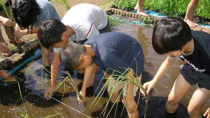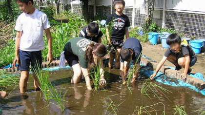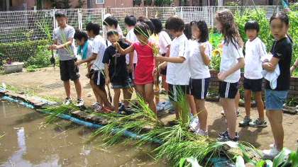 お話を聞いた後、「やはたファーム」の田んぼに裸足ではいって、みんなで田植えをしました。苗はだいぶ伸びていて、数も少ないので、苗の間隔がだいぶ空いていますが、植え終わった後で、うまく育ってくれるよう見守っていました。