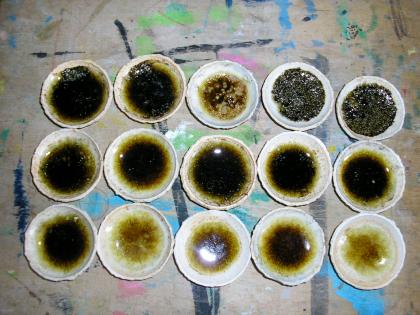 学校の砂から作成するガラスは、篩いで砂粒をそろえ、貝殻やチョークを入れたり、重曹を混ぜ込み、柔らかくて透明なガラスに近づけていきます。それぞれ混ぜ合わせる割合によって色や柔らかさが変わります。