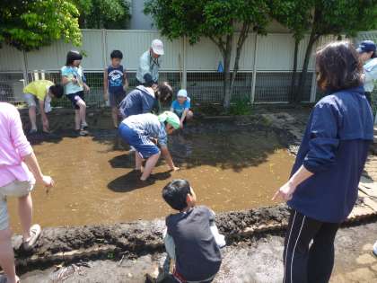 水の中に入った子どもたちは大興奮!何度も入りたがりました。今年こそ、雀に負けずに大豊作を目指します。