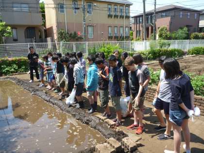 今日は、世田谷目黒農協の協力で、5年生が田植えを行いました。田んぼの土の改良もうまくいき、水もれはほとんどなくなりました。土も一度全部出して、荒木田土を下にしき、そこにまた戻したため、いい状態の柔らかさになりました。