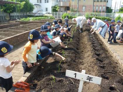 今日は一年生がサツマイモの苗と花の苗を植えました。銀雄クラブの方々が準備してくださった畑に、順番に苗を植えていきました。また、種もきれいにまいていました。