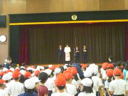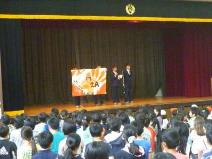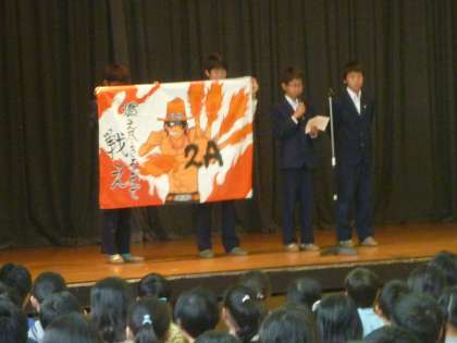 今朝の朝会で、八幡中の生徒が来校し、6月1日にある運動会の紹介をしてくれました。競技の内容や小学生の出場できる種目の紹介、クラス旗コンテストのことなど、わかりやすく話してくれました。