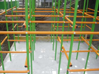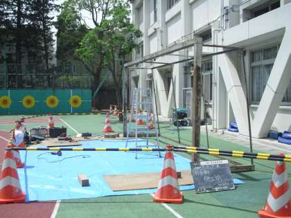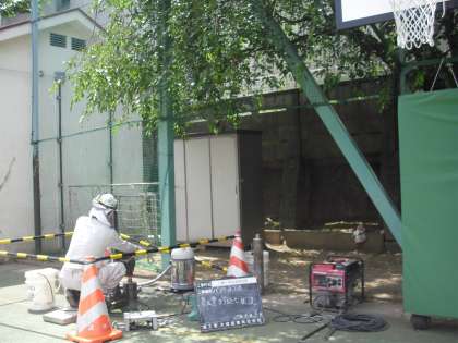 校庭の遊具や防球ネット、サッカーゴール塗装工事が行われています。2週間かかります。