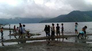 中禅寺湖菖蒲が浜に到着。予定より少し早かったので乗船までの時間、浜で少し遊びました。