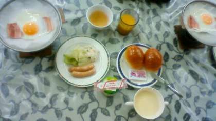 おはようございます。朝会は、「眠い。」の声があちらこちらから聞こえてきました。朝食をしっかり食べて、元気になります。いただきます!