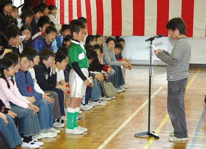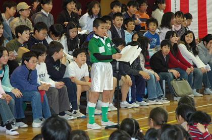 みんなで楽しんだゲームに続いて、全校児童の前で6年生代表が思い出や卒業に向けての決意、在校生へのメッセージを述べました。それに応えて5年生代表が決意を語りました。代表の言葉も立派でしたが、それに聞き入る子ども達の姿が印象的でした。1〜5年生も、きっと立派に八幡小学校を担ってくれることでしょう。