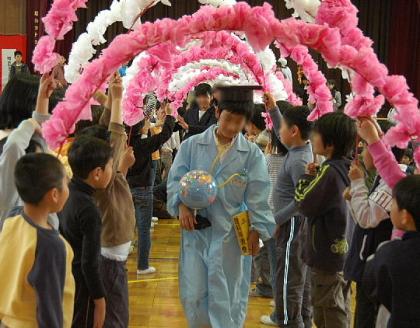 6年生を送る会の最後は、3年生が作った花のアーチをくぐって退場です。