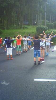 おはようございます。三日目の朝です。今朝はとても眠そうな子どもたち。さあ、ラジオ体操でスッキリです。