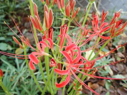 一昨日、芽がふくらんでいた彼岸花、きれいに咲き始めました。別名、曼珠沙華ともいわれるこの花は、様々な別名を持っています。地獄花(じごくばな)、幽霊花(ゆうれいばな)、剃刀花(かみそりばな)、狐花(きつねばな)、捨子花(すてごばな)、はっかけばばあ等と散々に言われています。全身有毒なので、そのように言われているのかもしれません。