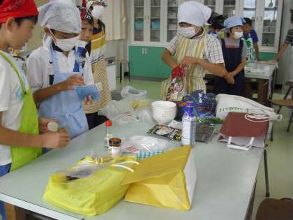 木曜日に6年生の家庭科調理実習がありました。主食と主菜を一つにした料理を各グループごとに作りました。