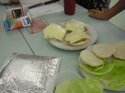 1班 ハンバーガー、ベーコン・目玉焼きをサンド
