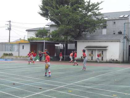 小雨の降る中、校庭で野球チーム八幡イーグルスが練習しています。フリーバッティングなどきびきび活動していました。