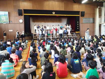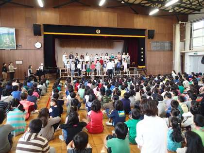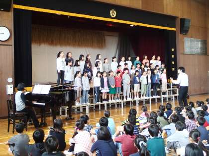 月曜朝会の時に、合唱団が八幡中の学芸発表会用の曲を全校児童の前で歌いました。少し緊張気味のメンバーでしたが、始まるとしっかり指揮を見つめていました。