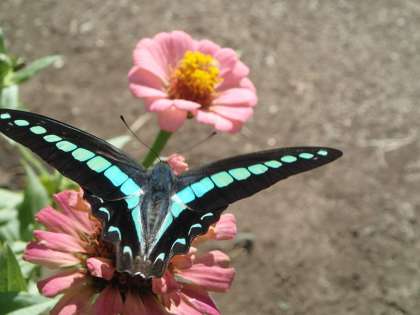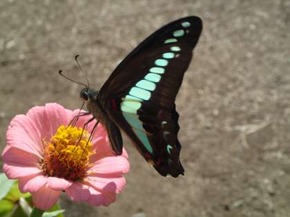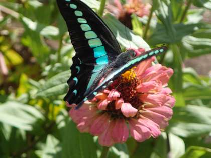 八幡ファームの蝶の常連、アオスジアゲハです。美しい青の模様が輝いています。飛行速度が速いので知られています。元々、南方の蝶ですが、最近は普通に見られるようになりました。食草はクスノキです。
