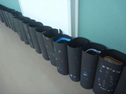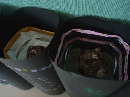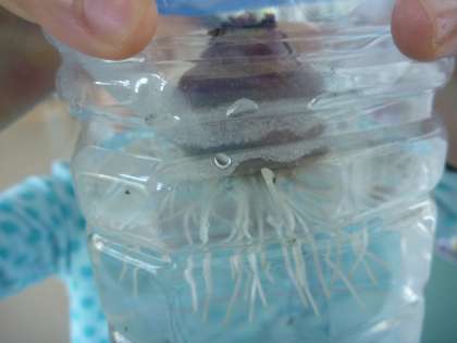 2年生は球根のヒヤシンスをペットボトルで育てています。ただ、明るいと根が育ちません。そこで、黒い紙で周りを覆い、光を防いで育てます。もう、根が長く伸び始めました。子どもたちは喜んで見せに来てくれました。きれいな花が咲くといいですね。