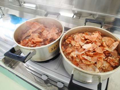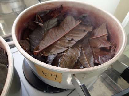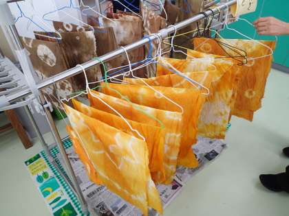 今日は5年生が染色の授業を行いました。使ったのはビワの葉とタマネギの皮。それを煮込んで絞りで模様を作り、焙煎します。きれいに布が染まりました。