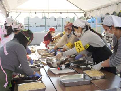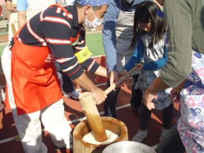 付き上がったおもちを磯辺もち、きなこもち、あんこもち、豚汁をくばりました。校庭で美味しそうに家族で食べていました。子どもたちもおもちをつく体験をしました。