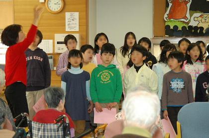 12日午後、本校合唱団の子どもたちが「ディホーム玉川田園調布」を訪問し、地域のお年寄りの皆様に歌を聴いていただきました。お年寄りの中には、八幡小学校を卒業された方もいらっしゃるなど、皆さんに、とても喜んでいただき、子どもたちもとても満足そうでした。このような機会をあたえていただきありがとうございました。