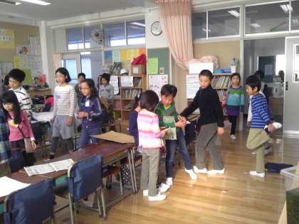 5、6班は1分間ゲーム ボールつき新聞紙のの字探し 片足立ち です。