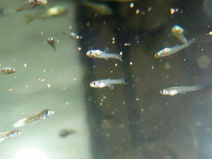 ところが、そのお母さんがついに小さな赤ちゃんを産みました。それも時間をおいて3回ほど。産んでいる間は水草の中に隠れています。グッピーは卵胎生なので、生まれた時から卵ではありません。とても小さいけれど、しっかり魚の形をしています。透明で眼ばかり大きいかわいい赤ちゃんです。