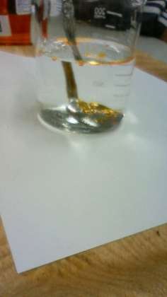 これから洗剤のはたらきを確かめる実験です。ラー油を入れたビーカーに洗剤を注ぐと…「わあ。」と、その変化に驚きの声です。