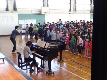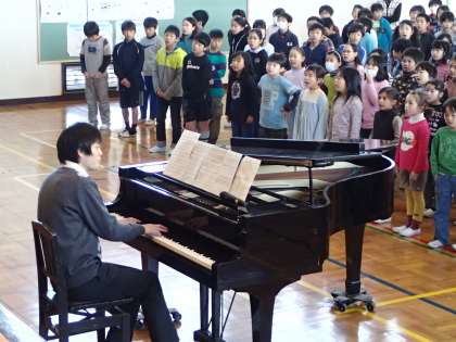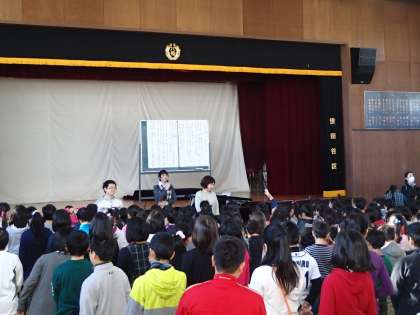 音楽朝会では、様々な歌が登場しますが、今回は「上を向いて歩こう」です。1961年に作られた曲で、もう半世紀前になります。そのメロディーが子どもたちの元気な声で体育館に響き渡りました。歌っていた坂本九さんは飛行機の事故で亡くなられましたが、今でも歌はこのように引き継がれています。