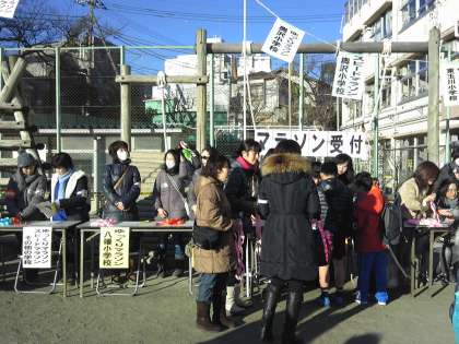 東玉川小学校の校庭っ奥沢祭りマラソン大会が行われます、八幡小学校の参加者も多く盛況です。