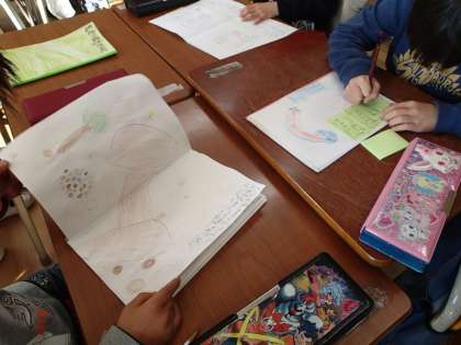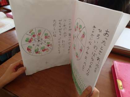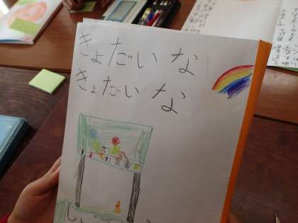 1年生の絵本作り、タイトルは「きょだいなきょだいな」です。教科書にのっているもののパロディとして自分たちで物語を考え、絵本を作りました。
