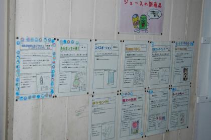 八幡中学校の社会の時間に「中学生が考えた清涼飲料水」のアイディアを、写真のように本校の掲示板にはり、同じく工業の学習をした5年生が気に入ったものを選んで投票しました。これが、今後少しでも小学校と中学校の学習交流につながればと考えています。