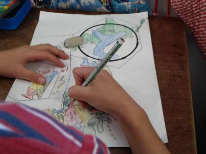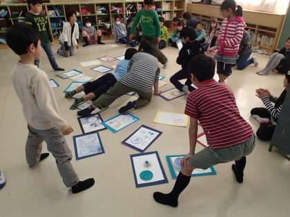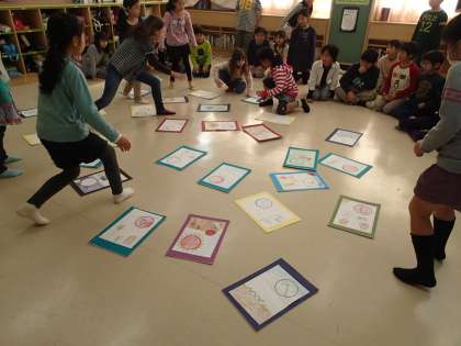3年生が教室いっぱい使って自作の大判カルタを使ってカルタ大会をやっていました。先生が動物の名前が入ったふだを読むと、みんな一斉にカードを探しわれ先にとびこんでいました。楽しい学習でした。