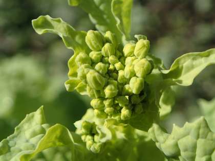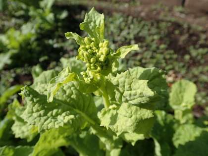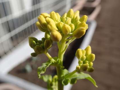 学校園の植物の中で一番早く、アブラナの花芽が伸びてきました。葉っぱも柔らかくておいしそうです。ちょっと拡大して見てみました。黄色の愛らしい姿が春が近いことを伝えてくれました。雪に負けずに大きく育ってほしいですね。