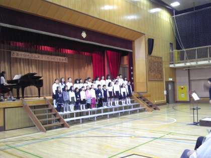九品仏小学校有志合唱です。一年生二年生も参加しています。口を大きく開けて歌声が届きました。