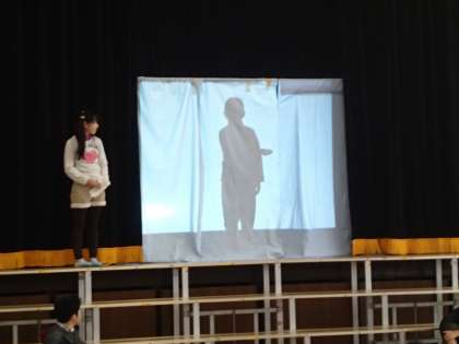 今日の児童集会は、布に裏からプロジェクターで光を当てて、そこに写った影をみて、問題に答える形で行いました。