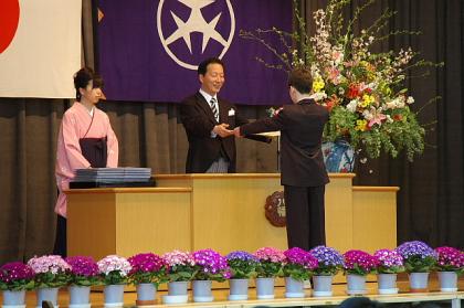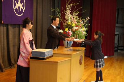 卒業生一同が整列し、開式の言葉の後、国家斉唱。卒業証書授与は、まず一人一人がステージ上で自分の決意を語り、その後に証書を受け取りました。決意は、どの子も自分らしさや夢、思いを精一杯表現したもので、静まり返った満場の人々に感銘を与えました。校長からも、証書授与の際、一言ずつ言葉をかけました。