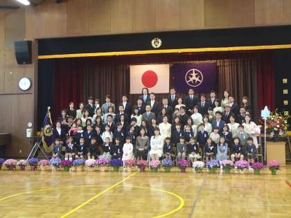 今日は入学式でした。桜の花も残る晴天の中で、新一年生が元気に入学してきました。子どもたちは、誇らしげに、またうれしそうに受付に並びました。そこで六年生に名札をつけてもらい、ワクワクした顔つきで新教室に入っていきました。