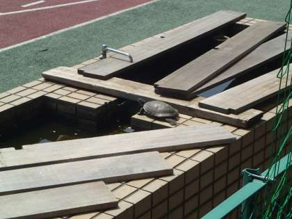 また、以前はよく校庭に間違って落ちてしまっていたのですが、最近はとても上手に上に這い上ります。気持ちよさそうに首を伸ばしている姿はユーモアたっぷりです。